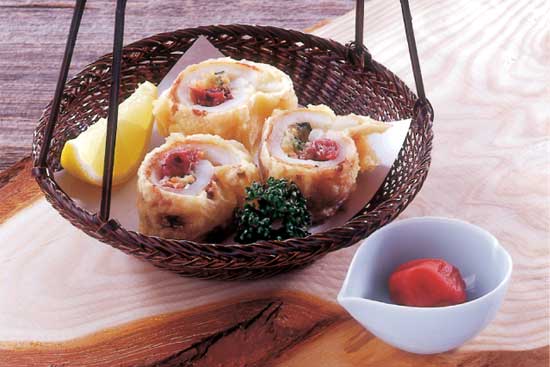 アジの開きにすし梅しそ入りを塗り、しその葉をのせて巻き、楊枝でとめる。