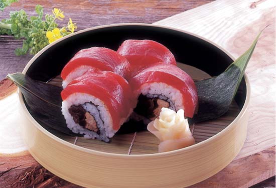 千瓢、ツナをのりで巻き、その外側を寿司飯で巻きます。最後にマグロを巻きます。