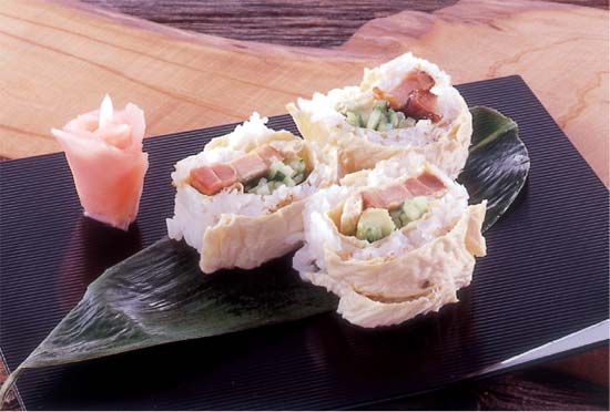 テリヤキチキン、アボガド、きゅうりの千切りを寿司飯で巻き、周りに胡麻をまぶし、外側を湯葉で巻きます