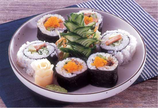 テリヤキ・ロール テリヤキチキンとアボガド、胡瓜の千切りを海苔で巻いて、その外側にごはんを巻く。周りに白ごまをまぶして出来上がりです。