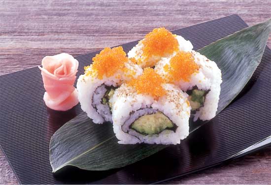 アボガドと胡瓜で巻きものをつくり、ごはんをさらに巻く。上にトビコをのせる。